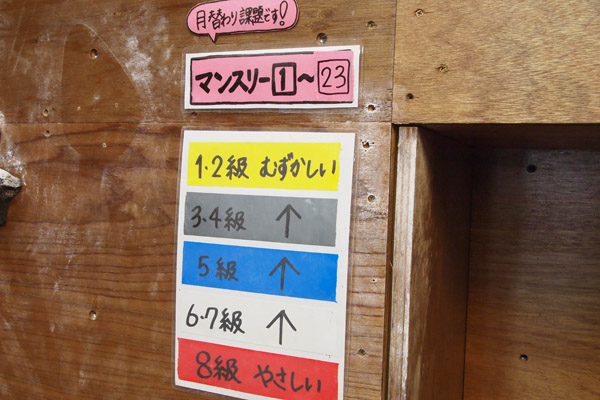 - 課題はテープの色と番号でわかれています。マンスリー課題の本数は月ごとに変わりますが、毎月20本以上の課題が設定されております。